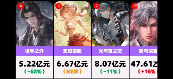 而且从流水来看,《光与夜之恋》能够跻身后四大绝不是充数,根据统计,2025年女性向游戏全年流水榜单,第一名是《恋与深空》以47.61亿的绝对性优势成为当之无愧的榜首,而第二名就是《光与夜之恋》,年流水8.07亿,甚至超过了2024年年底才上线的新游《无限暖暖》。