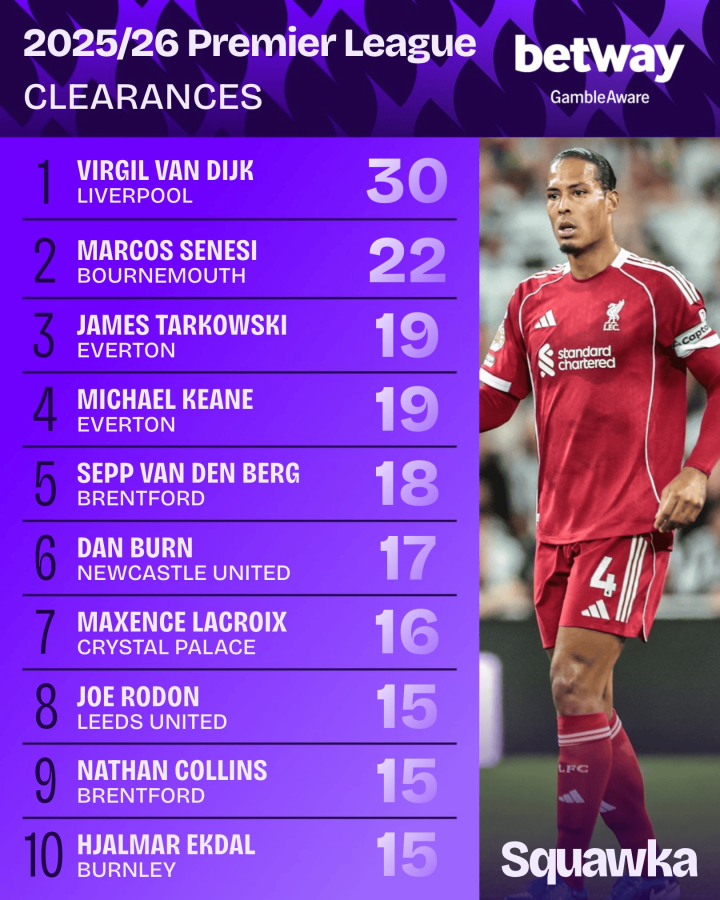 英超解围榜: 范戴克遥遥领先, 塞内西、丹-伯恩在列