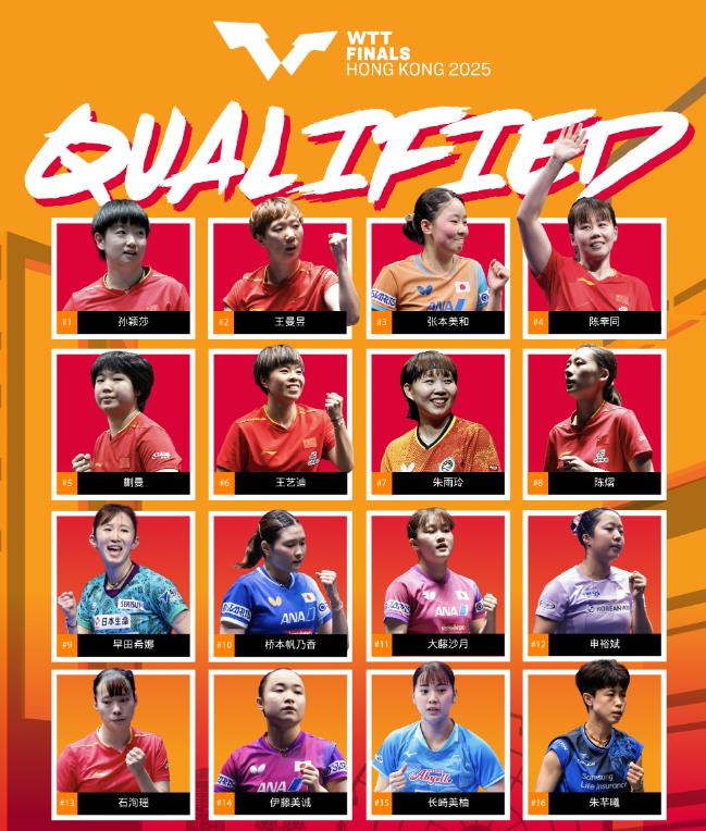 WTT总决赛女单16强名单出炉: 国乒7人日本6人, 孙颖莎王曼昱领衔